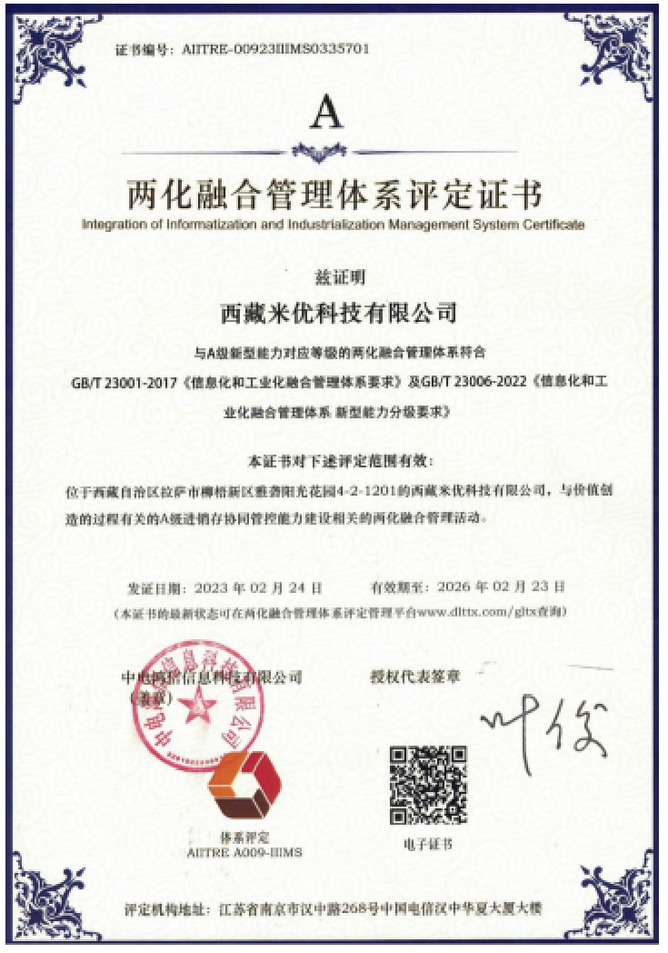 西藏米优科技有限公司位于拉萨市高新区,是国家高新技术企业,由北京德威全资控股。公司以技术兴藏为使命,专注于西藏本土信息化实施及服务。米优科技的三大业务主线是:自研产品销售;信息化集成及服务;软件定制开发。公司拥有完善的研发管理体系和全面的质量管理体系,通过了CMMI国际认证(软件能力成熟度模型集成)、两化融合管理体系、ISO9000三体系等认证。同时建立了一支专业化的研发团队,本硕学历占比75%以上,拥有5项专利和20余项软件著作权.